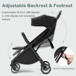 - ++👶Adjustable+Design:+1.+The+back+of+the+lightweight+stroller+can+be+easily+adjusted+to+any+angle+of+100°~+145°.+suitable+for+baby+lying+down+or+sleeping.+2.+The+footstool+of+the+infant+stroller+can+be+adjusted+in+3+different+positions+to+achieve+the+most+comfortable+position.+3.+The+canopy+can+be+adjusted+according+to+different+weather+conditions+to+provide+the+best+resting+environment+for+the+baby.++