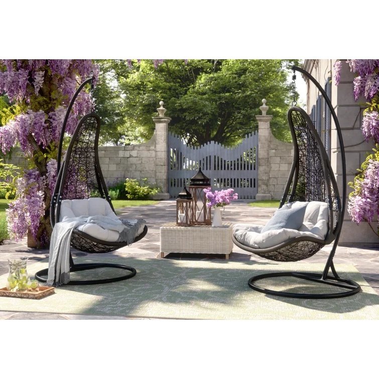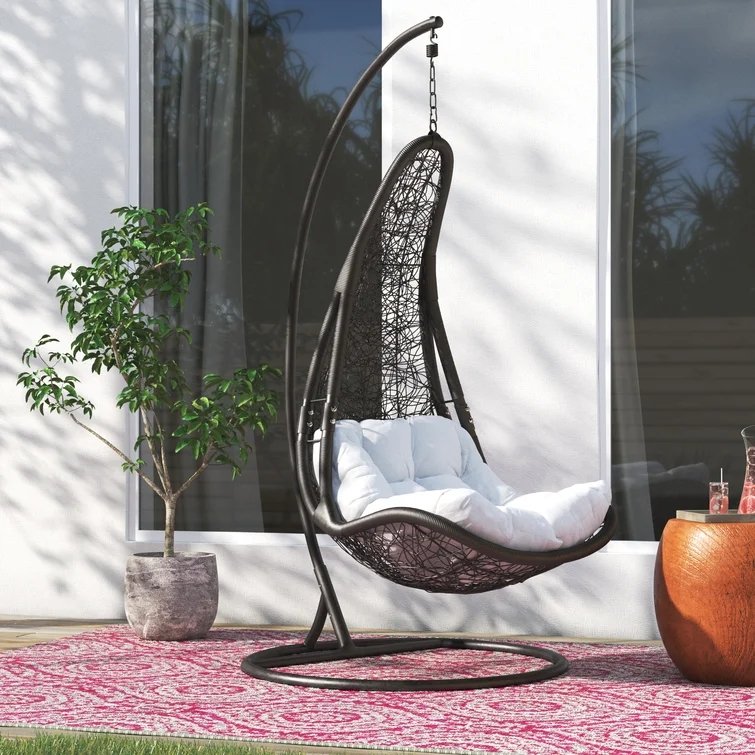 - DescriptionFusing+function.+fashion.+and+fun.+this+traditional+swing+chair+lends+an+eye-catching+focal+point+to+any+space+while+providing+a+place+to+perch+and+relax.+It+features+a+free-floating+chair+with+an+openwork+design+that’s+crafted+from+wicker+rattan+in+a+black+finish.+The+curved+base+connects+to+an+angled+arm+made+from+powder-coated+steel+that+holds+up+the+chair+with+a+handy+chain.+And+it’s+designed+to+resist+water.+making+it+the+perfect+pick+for+the+porch+or+patio!+Best+of+all.+this+hammock+comes+with+polyester-upholstered+cushions+stuffed+with+foam+and+polyester+filling+for+a+touch+of+texture.