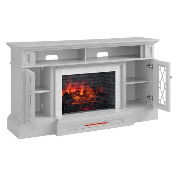 Bring+the+theater+experience+to+your+home+with+this+Parkbridge+Fireplace+TV+Stand.+Its+transitional+styling.+light+gray+finish+and+Italian+Carrara+marble+surround+are+sure+to+make+it+the+focal+point+of+any+room+in+your+home.+A+generous+open+center+panel+is+perfect+for+media+components.+2+soft-close+doors+open+to+reveal+adjustable+interior+shelves+for+media+and+accessories.+Hand+crafted+moldings+add+to+the+design+and+appeal+of+this+mantel.+A+26+in.+infrared+electric+insert+adds+ambiance+and+warmth+that+can+be+enjoyed+all-year+round.